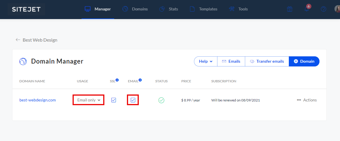 Wenn du E-Mail-Services für eine Domain aktivieren möchtest, gehe zum Domain Manager und aktivere das E-Mail-Kästchen für die entsprechende Domain.