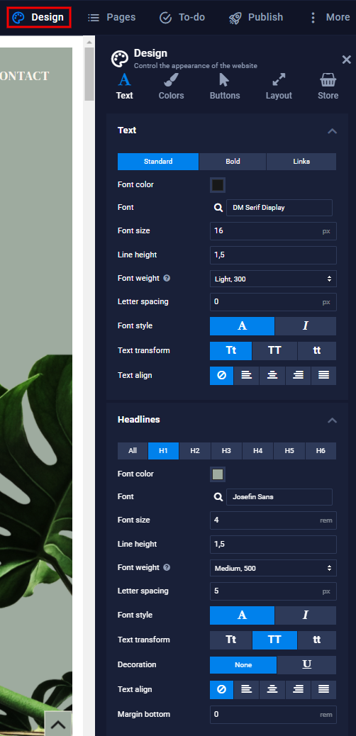 Unter Design kannst du Design-Einstellungen für die komplette Website definieren, um einen konsistenten Style zu gewährleisten. Darunter fallen Schriftarten, Schriftgrößen, Farben, Layout-Einstellungen und vieles mehr.