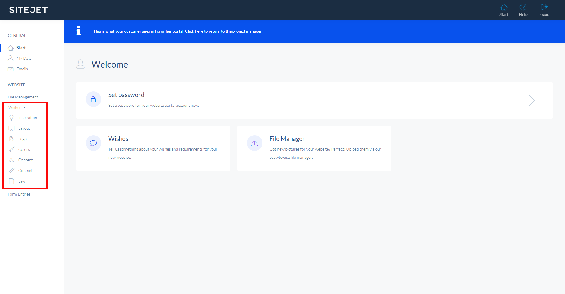 - Wünsche: Mit diesem Feature gehen dein Kunde und du Schritt für Schritt alle notwendigen Themen für die Website-Erstellung durch, sodass du ein perfektes Briefing hast mit allen Infos, Anforderungen und Dateien wie Logo und Bilder, um die perfekte Website für deinen Kunden zu erstellen.