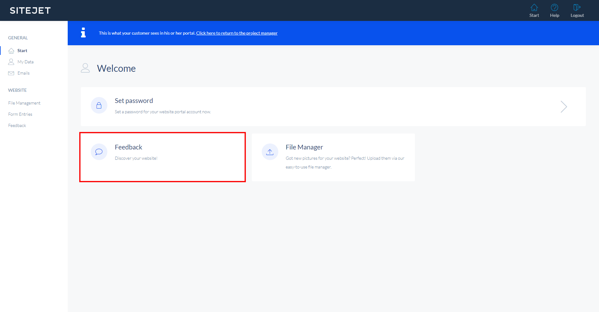 Im Kundenportal wurde deinem Kunden eine neue Option freigeschaltet. Wenn er auf Feedback klickt, kann er die Website im Vorschaumodus bewundern. Auf der rechten Seite findet der Kunde eine kurze Erklärung zum Feedback Tool, damit er Anmerkungen und Notizen direkt an der richtigen Stelle auf der Website hinterlegen kann. Damit erspart sich der Kunde lange Beschreibungen, wo er etwas geändert haben will und der Webdesigner wird bei der Überarbeitung mit nur einem Klick direkt zum entsprechenden Element geführt..