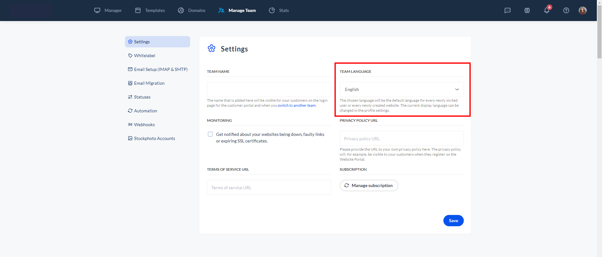 Um die Teamsprache einzustellen, gehe auf "Team managen" in der oberen Menüleiste des Website Managers und klicke auf "Einstellungen".