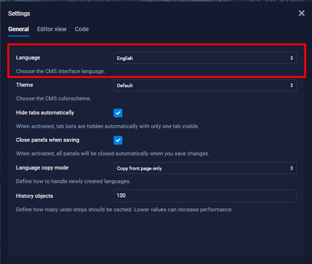 Das CMS wird standardmäßig in deiner Profil-Sprache angezeigt. Wenn du aber nur die Sprache des CMS ändern möchtest, kannst du auf das Burger-Menü klicken und unter "Einstellungen" deine gewünschte Sprache auswählen. Auch hier kannst du zwischen den folgenden Sprachen wählen: