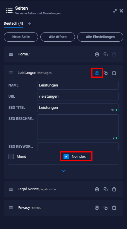 Wenn du auf das Zahnrad klickst, öffnen sich weitere Einstellungen wie bspw. die URL, unterseitenspezifische SEO-Informationen wie Meta Title und Description. Außerdem findest du da das Feature "Noindex". Wenn du das über die Checkbox aktivierst, werden die Unterseiten nicht bei Suchmaschinen gelistet. Um die Unterseiten zusätzlich zu schützen, kannst du einen Passwortschutz einrichten.