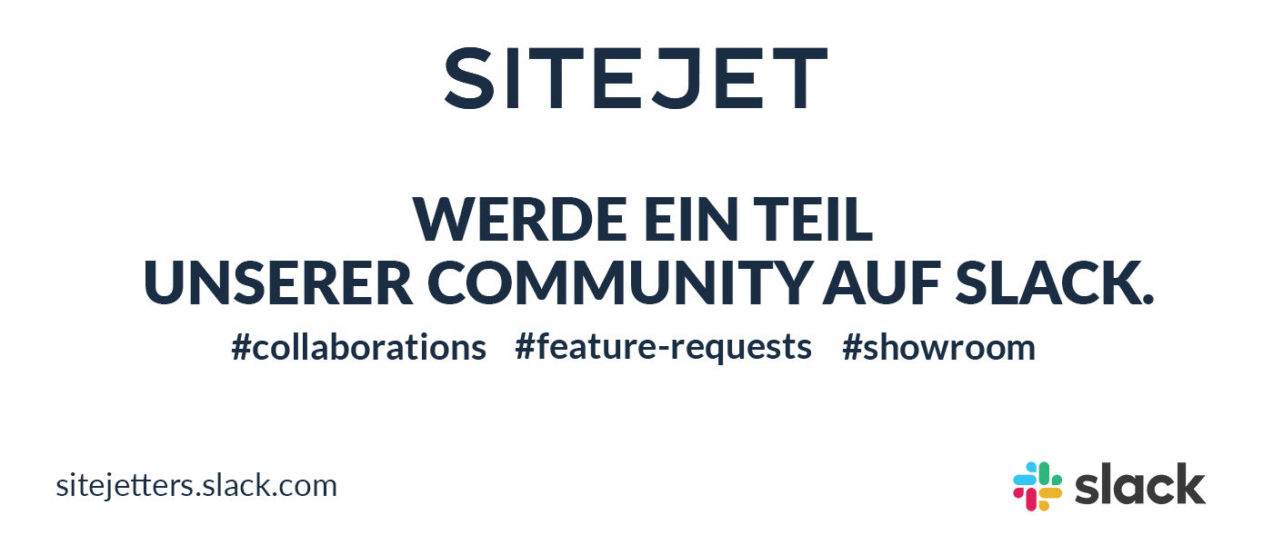 Tausche dich mit anderen Webdesignern über aktuelle Entwicklungen, Tipps und Tricks aus und zeige deine Lieblingsseiten. Hole dir Ratschläge und sprich mit uns über mögliche Funktionen, die du dir für Sitejet wünschst. Hier gelangst du direkt auf unsere Community. Wenn du Hilfe bei deinem Slack-Account benötigst, schreib uns eine E-Mail an help@sitejet.io .