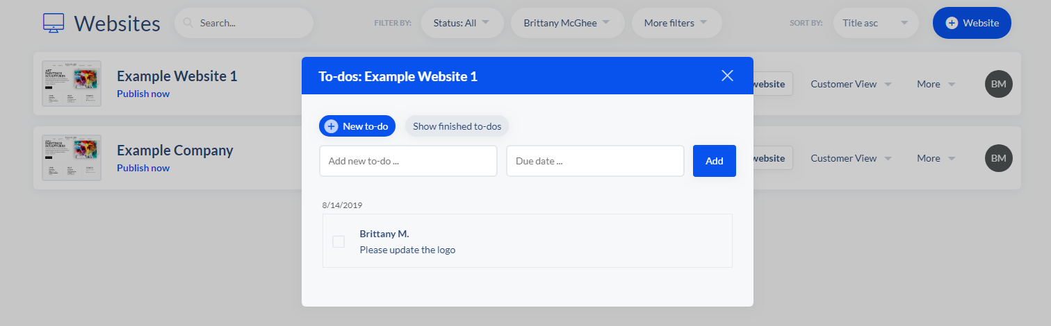Mit einem Klick auf das blaue "To-dos"-Icon gelangst Du in den Detail View des Kunden. Unter To-dos verwaltest du alle projektbezogenen To-dos. Hier werden dir sowohl die To-dos, die über das Feedback-Tool von deinem Kunden angelegt wurden, wie auch die To-dos, die du und dein Team angelegt haben, angezeigt.