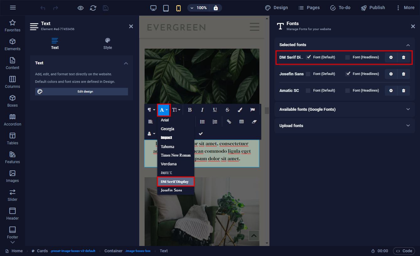 Sobald du Schriftarten deiner Website hinzugefügt hast, stehen dir diese in sämtlichen Elementen, die Text anzeigen, zur Verfügung, sofern deren Schriftart nicht durch Preset-Eigenschaften festgelegt wird. Die jeweilige Schriftart kannst du dann per Klick auf das "A"-Icon auswählen, nachdem du in den Bearbeitungsmodus des Textfeldes gewechselt bist. Näheres siehst du im hier angezeigten Bild: