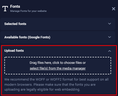Solltest du eine Schriftart benutzen wollen, die nicht unter "Verfügbare Fonts" aufgelistet wird, so hast du die Möglichkeit eigene/zusätzliche Fonts per Klick auf "Fonts hochladen" hinzuzufügen.