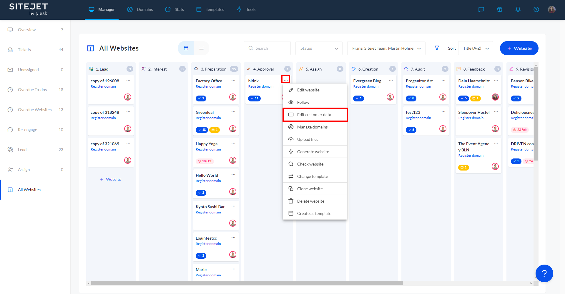 Um die Kundendaten zu bearbeiten, kannst du entweder aus dem Website-Manager oder aus der Detailansicht des Kunden darauf zugreifen.