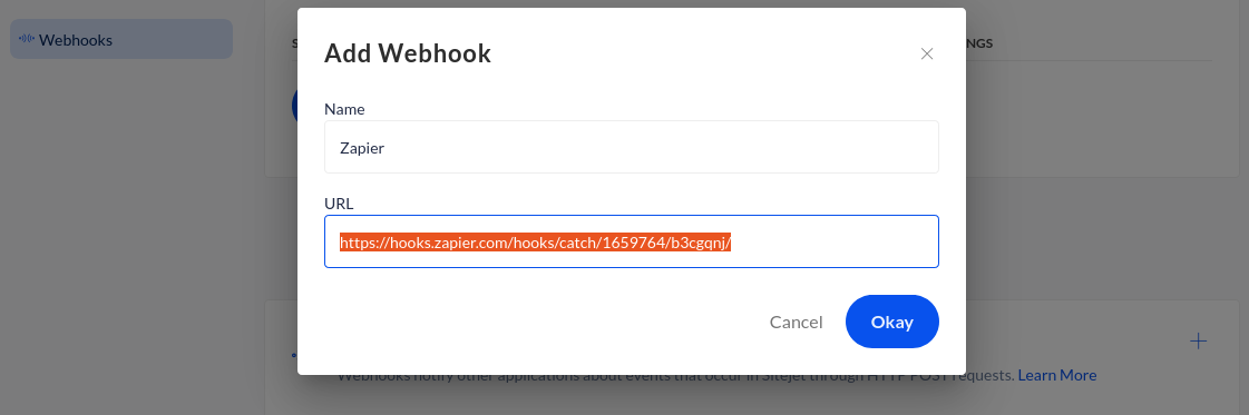 4. Gehe jetzt zu Sitejet Einstellungen Webhook, füge einen neuen Webhook hinzu, ergänze einen passenden Namen und füge die URL ein.