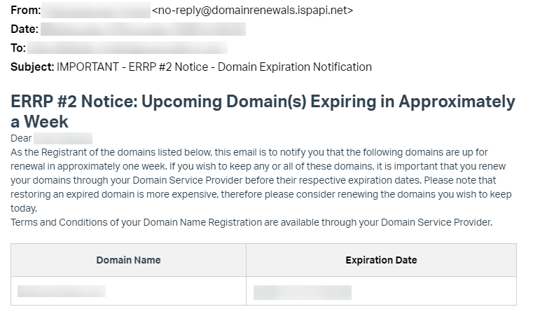 2. "IMPORTANT - ERRP #2 Notice - Domain Expiration Notification"