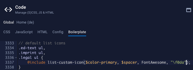 - Klicke auf den Code Button in der unteren linken Ecke des Editors und gehe dann zum Tab Boilerplate. Suche nach diesem Code Snippet (mit Strg + F) und kopiere es: