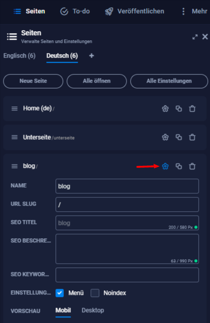 - Klicke hierzu bei der gewünschten Seite auf das Zahnrad Icon und klicke dann auf den Pfeil, um weitere Einstellungen zu öffnen.
