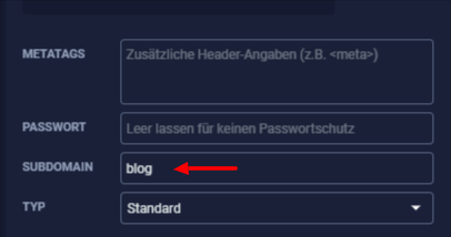 - Im Feld "Subdomain" ist der Standardwert "www" eingetragen. Setzt du diesen nun auf den gewünschten Wert, z. B. "blog", dann ist in diesem Fall zukünftig die Unterseite über die Internetadresse "blog.deine-website.de" erreichbar.