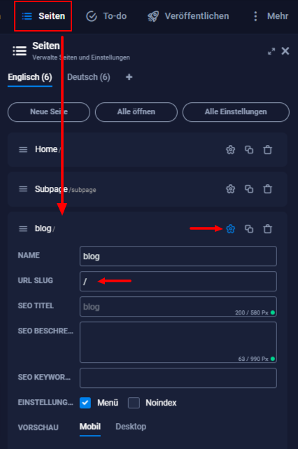 Wenn du für eine Subdomain eine Unterseite einstellen möchtest, ist dies auf einer Ebene in Sitejet möglich. Für deine Website blog.deine-website.de sieht das dann folgendermaßen aus:
