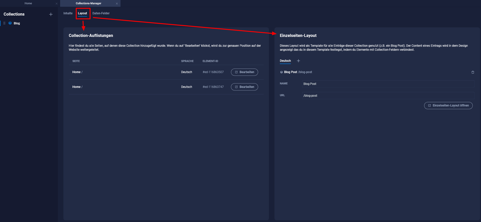 Das Einzelseiten-Layout definiert das einheitliche Design aller Collection-Einträge. Hier kannst du festlegen, wie dein einzelner Beitrag aussehen soll, wenn ein Besucher auf deiner Website auf den Eintrag klickt. Du kannst das Einzelseiten-Layout über Layout - Einzelseiten Layout aufrufen.