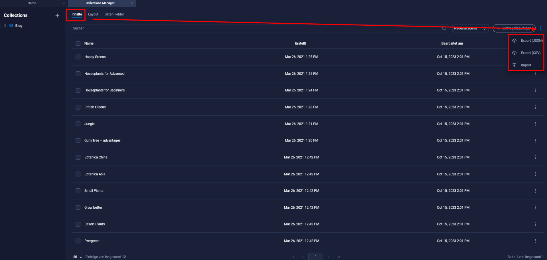 Über den Collections Manager hast du die Möglichkeiter über Content, am rechten Rand ein Dropdown zu öffnen. Hier gibt es die Option "Import".
