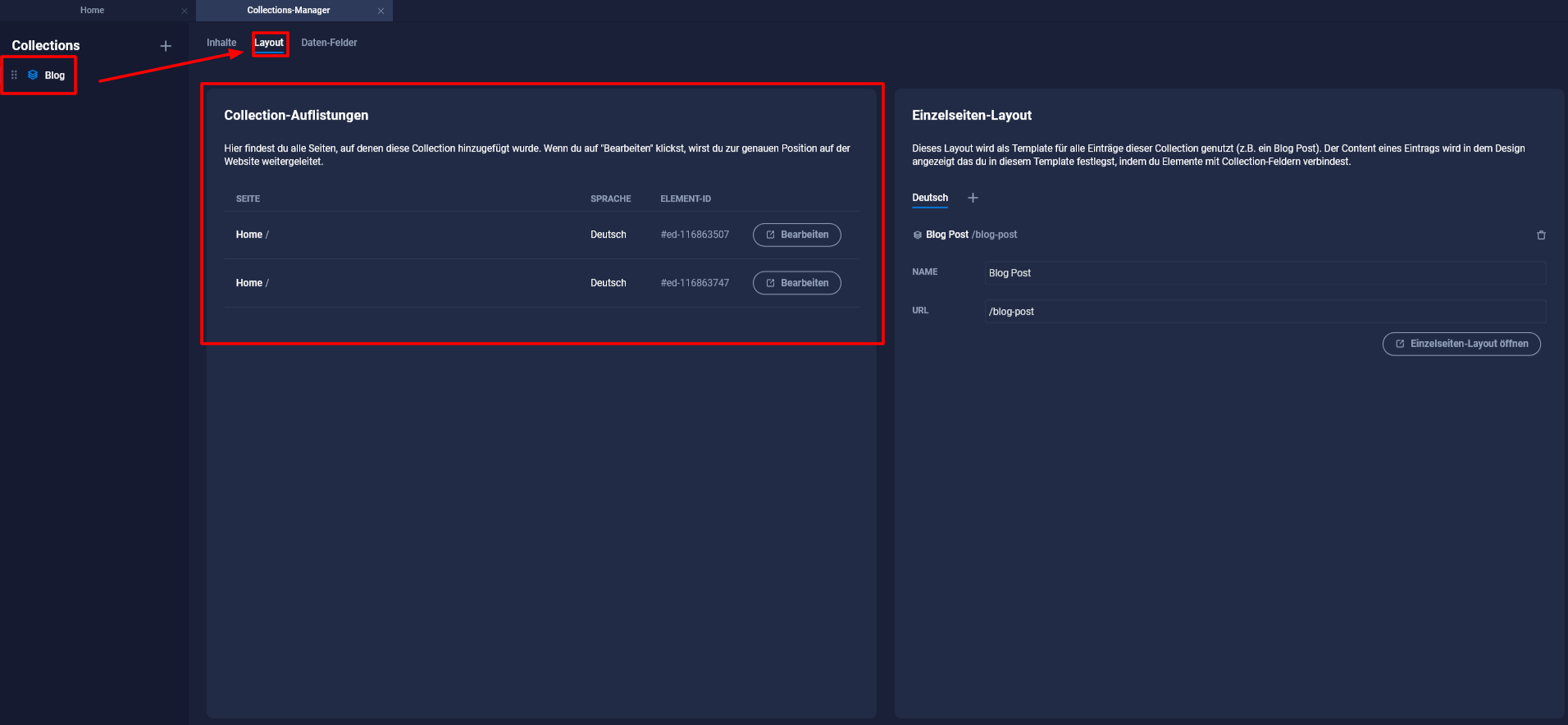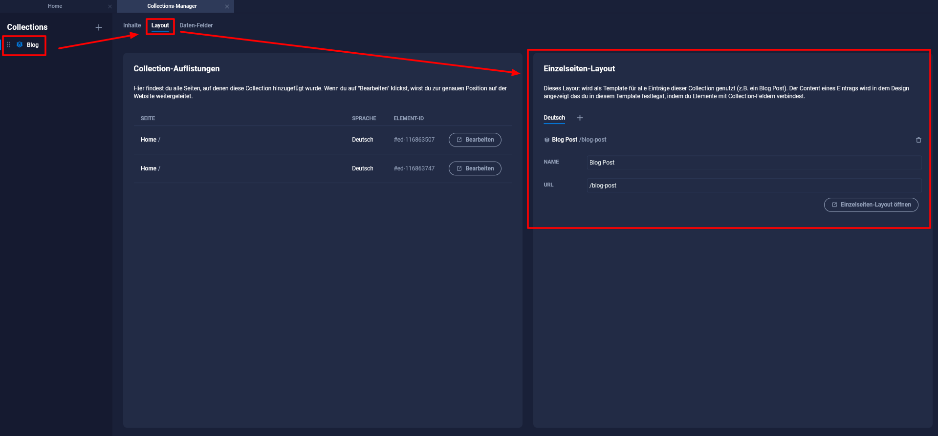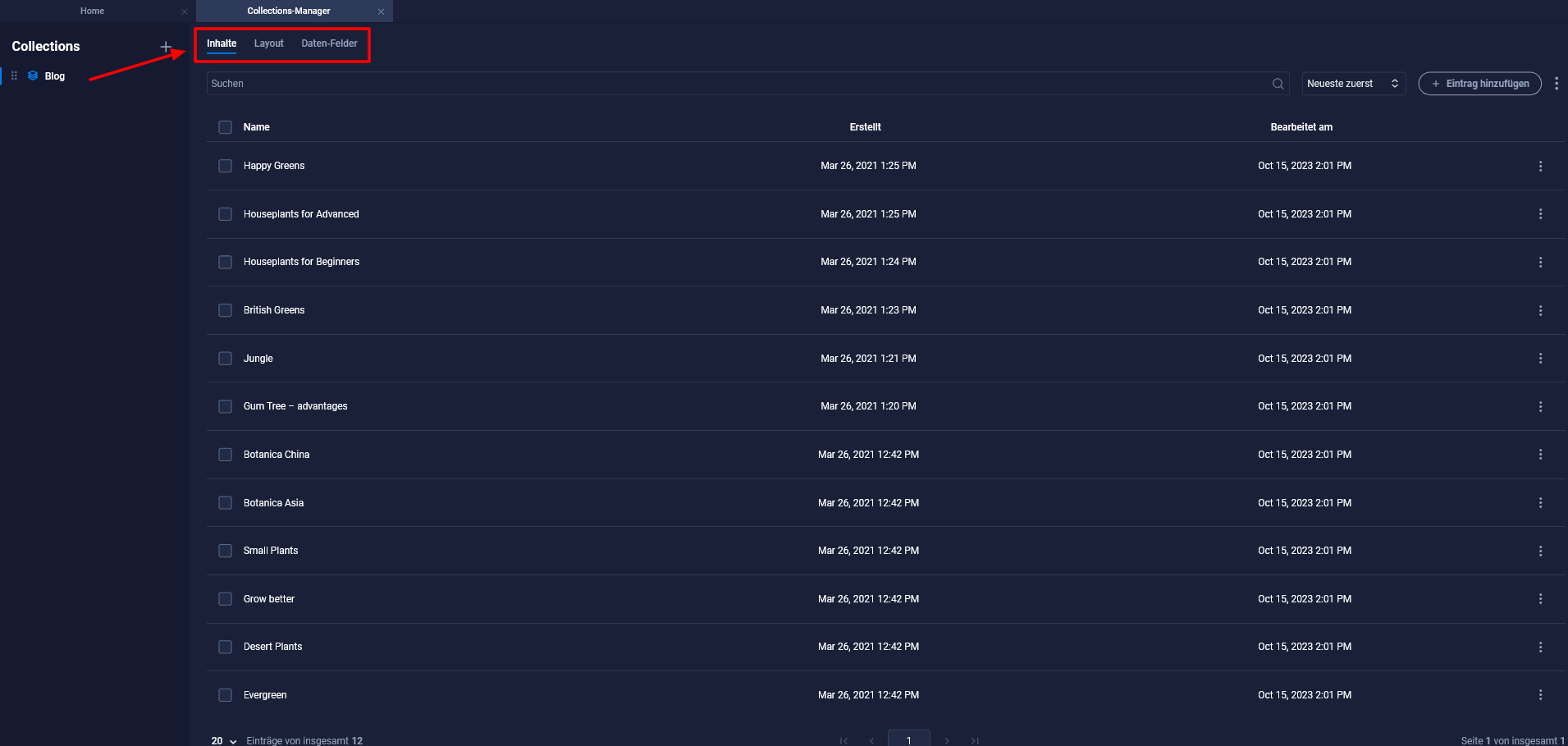 - Mit einem Klick auf die Collection öffnet sich im rechten Bereich für dich deine Verwaltung für diese Collection. Neben Content, findest du hier außerdem das Layout und die Daten-Felder.