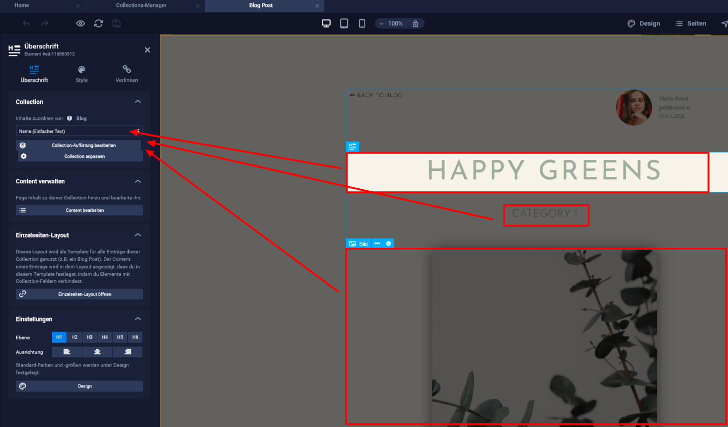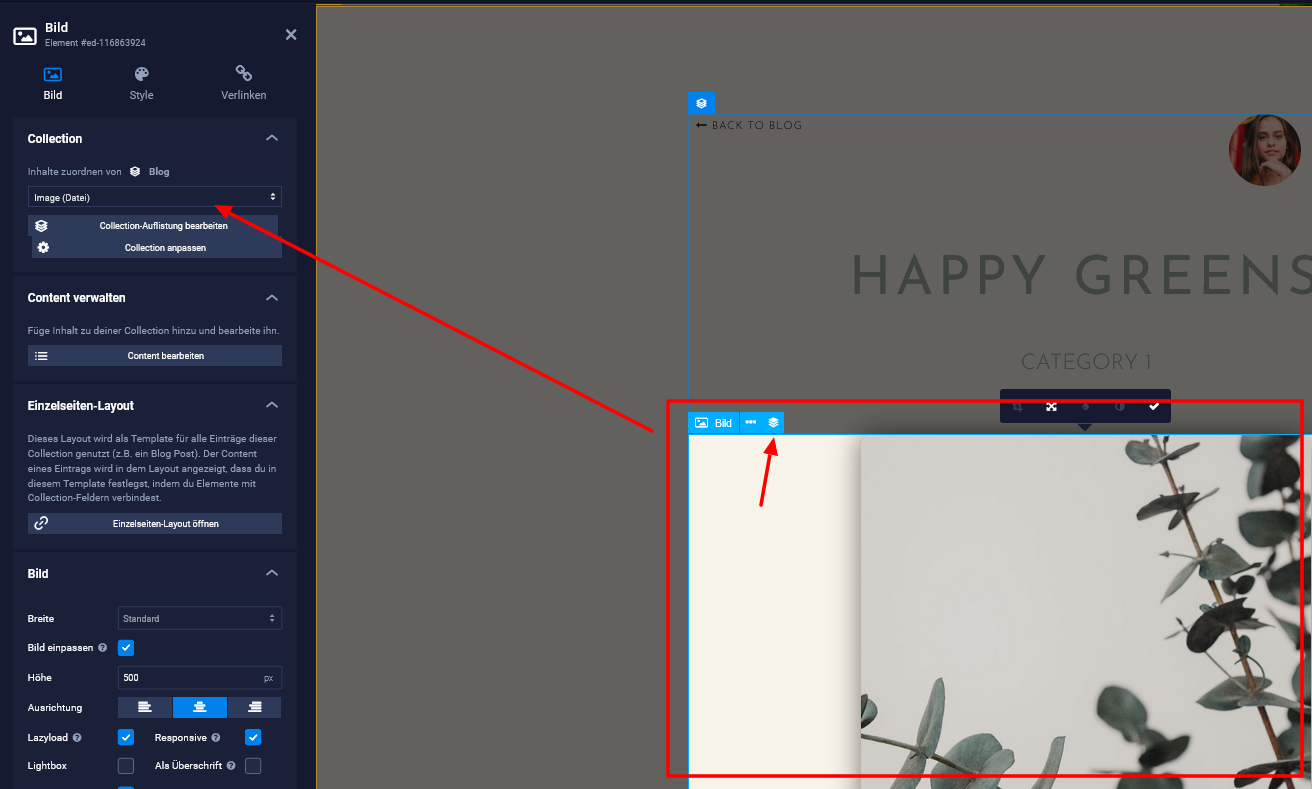 Du kannst jetzt das Einzelseiten-Layout wie jede andere Seite im Editor bearbeiten. Zusätzlich stehen dir nun alle Collection-Felder zur Verfügung um diese zu verlinken.