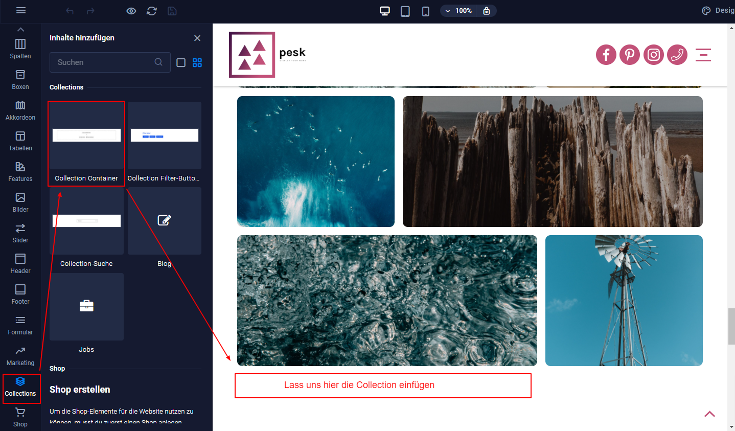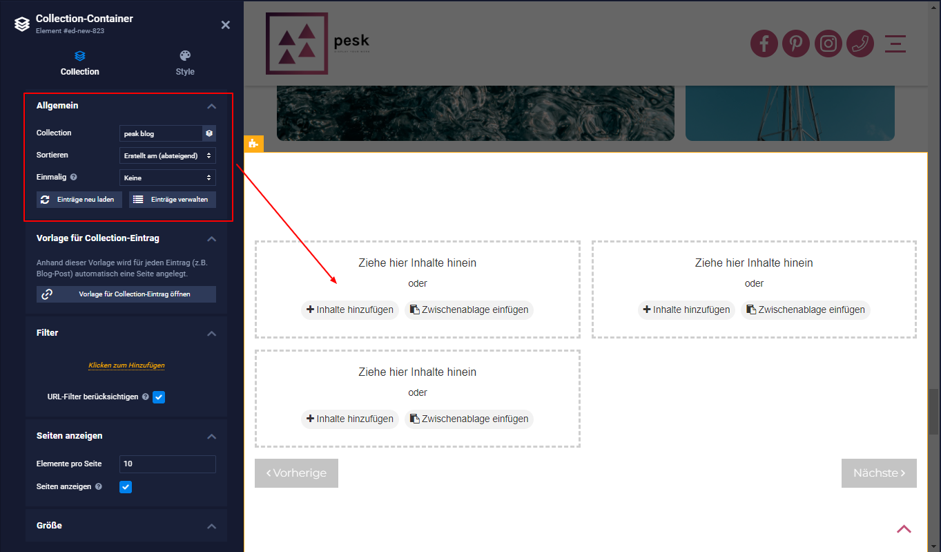 - Ziehe den Collection Container bitte jetzt an die Stelle in deiner Website, wo du die Vorschau angezeigt haben möchtest.