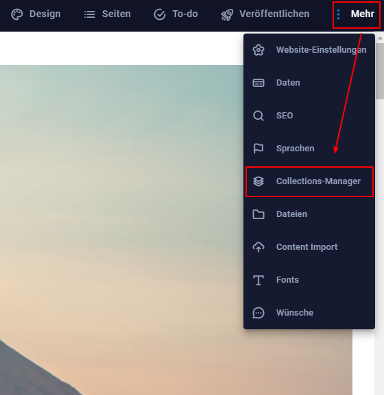 - Klicke im Website Builder im oberen Menü rechts auf Mehr > Collections Manager