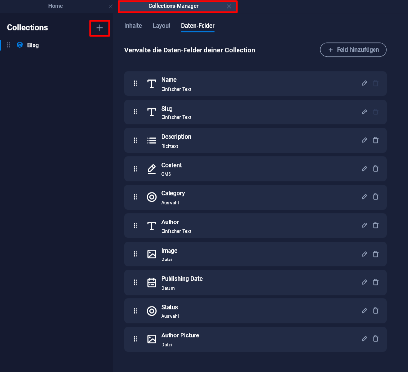 - Die Datenfelder wie Titel, Name, Bild, Beschreibung etc. definieren die Struktur des Contents für alle Collection-Einträge. Basierend auf diesen Datenfeldern wird eine Art "Formular" angelegt, das für jeden Collection-Eintrag ausgefüllt wird.
