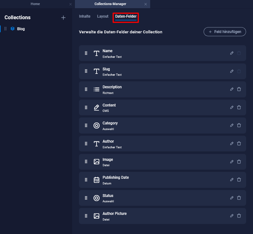 Felder halten in einem standardisierten Format bestimmte Informationen und Daten zum jeweiligen Eintrag bereit. Diese Felder kannst du entweder im Eintrag selbst oder im "Collection Container" ähnlich wie Databindings verwenden. Zu jedem Eintrag wird automatisiert aus der "Collection-Vorlage" und den Feldern eine eigene Seite erstellt.