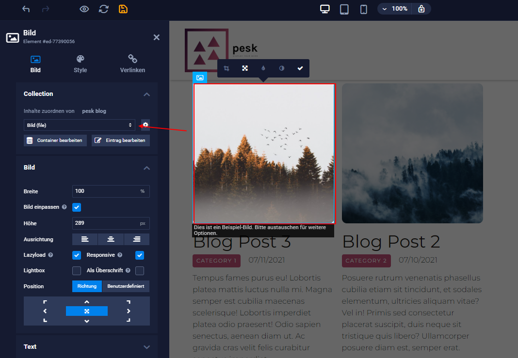 - Wähle zum Beispiel ein Bildelement, eine Überschrift 2 und 4 und Textfelder aus. Nun kannst du festlegen, welche Inhalte aus deiner Collection dort angezeigt werden sollen