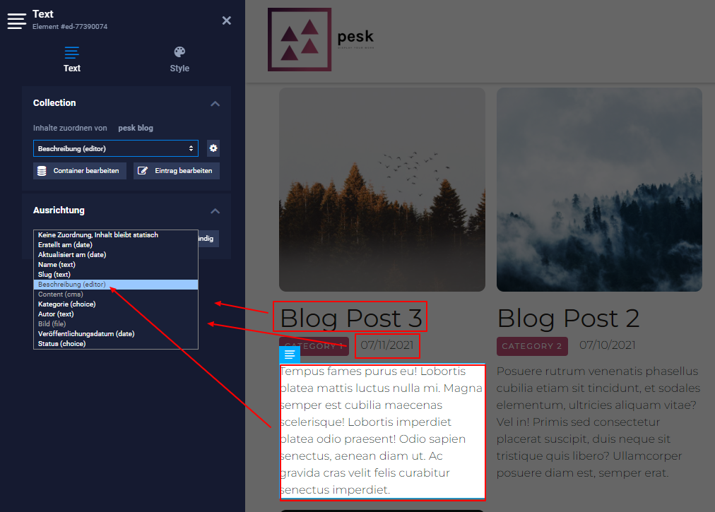 Es ist nun möglich für jeden deiner Einträge die Überschrift und den Inhalt anzupassen. Füge bitte für die Überschrift ein entsprechendes Element hinzu und verknüpfe es mit dem entsprechenden Collection-Feld. Wenn du zum Beispiel Content hinzufügen möchtest, der statisch bleiben soll, weise dem Element kein Collection-Feld zu, stattdessen belasse es auf "Keine Zuordnung. Inhalt bleibt statisch".