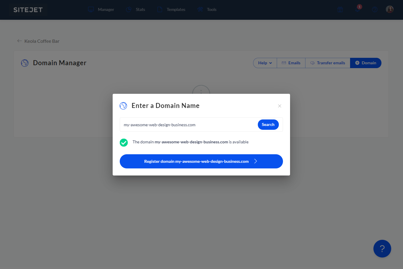 Füge jetzt die gewünschte Domain hinzu, unter der deine Website erreichbar sein soll. Klicke hierfür auf den "+ Domain"- Button auf der rechten Seite. Such nach der Domain, die du für diese Website registrieren möchtest. Wenn die Domain noch verfügbar ist, dann klicke auf "Domain XXX registrieren". Solltest du eine Domain verwenden wollen, die bereits woanders gehostet wird, kannst du diese auch mit Sitejet verbinden oder zu Sitejet transferieren.
