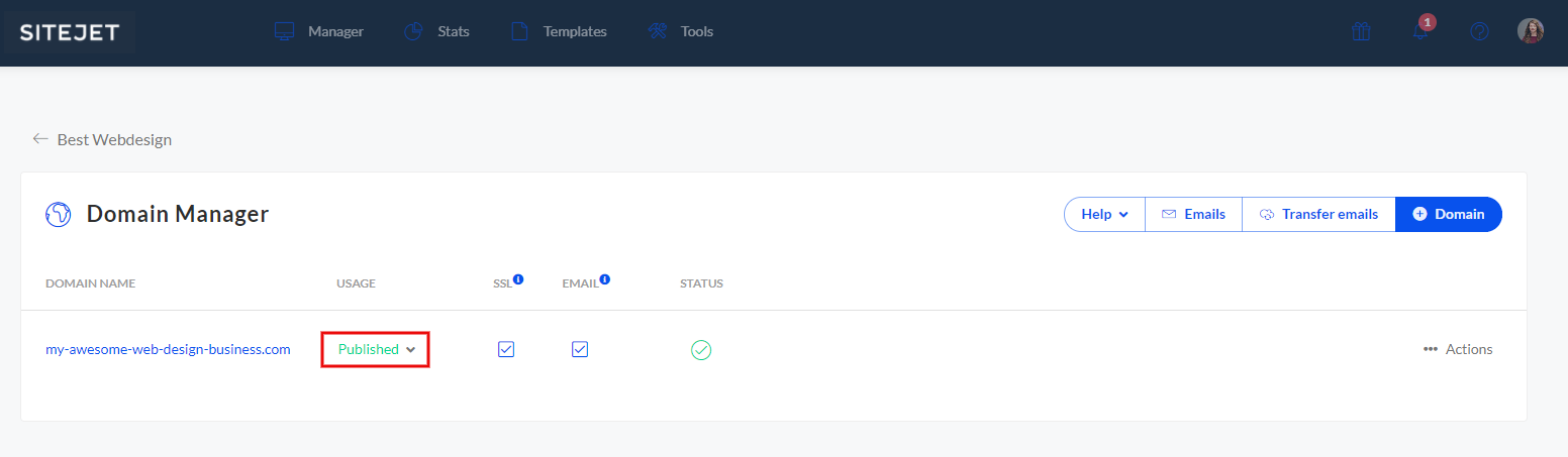 Die Aktivierung des Zertifikats ist mit Sitejet simpel. Im Domain Manager setzt du dafür den Haken in der Box bei "SSL". Der Domain Manager erstellt daraufhin automatisch ein SSL-Zertifikat für diese Seite. Die Website wird fortan über eine sichere HTTPS-Verbindung übertragen. Auch für deine Subdomain wird automatisch ein SSL-Zertifikat erstellt.