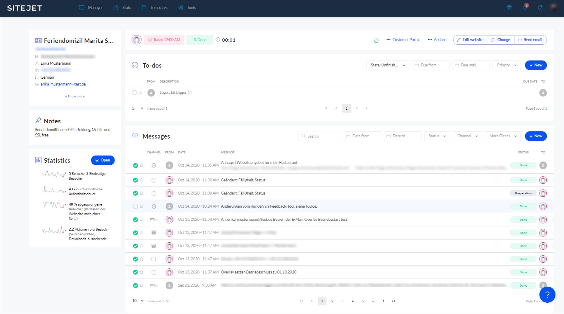 In the "Detail View" you will find all information about the website and the customer. The left side shows "static" information such as customer data (name, contact person, contact details etc.) while the right side is "dynamic" and changes with the progress of the website.