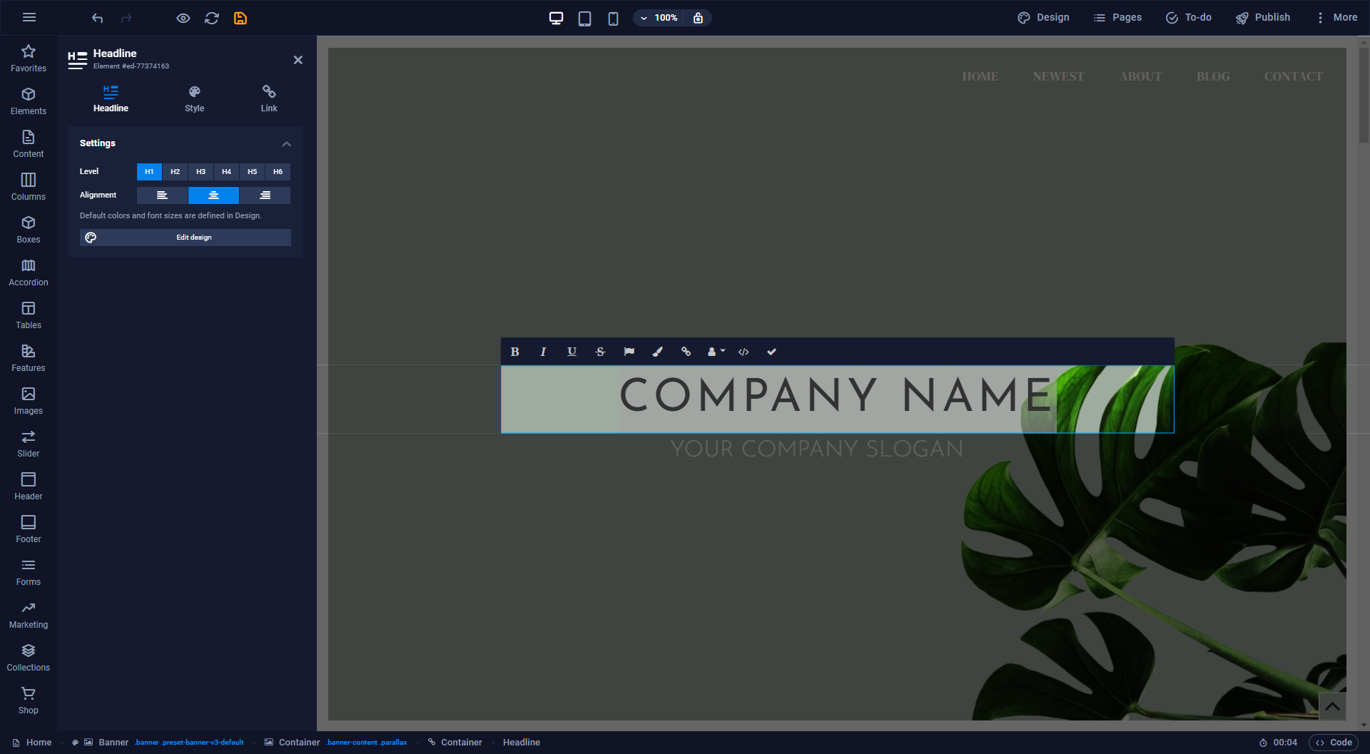 The now editable text is highlighted by a colored background. Type in the desired name (in this example "Company Name") and confirm with [Enter] or by clicking on the checkmark symbol. In the toolbar above the headline, you can also format the text (bold, italic, underlined, or crossed out) after you have selected the corresponding text. With the flag symbol, you can add icons, and with the brush icon, you can change the text color. Even more precise changes are possible in the internal HTML editor. This can be reached by clicking on the "<><></>" button. </>
