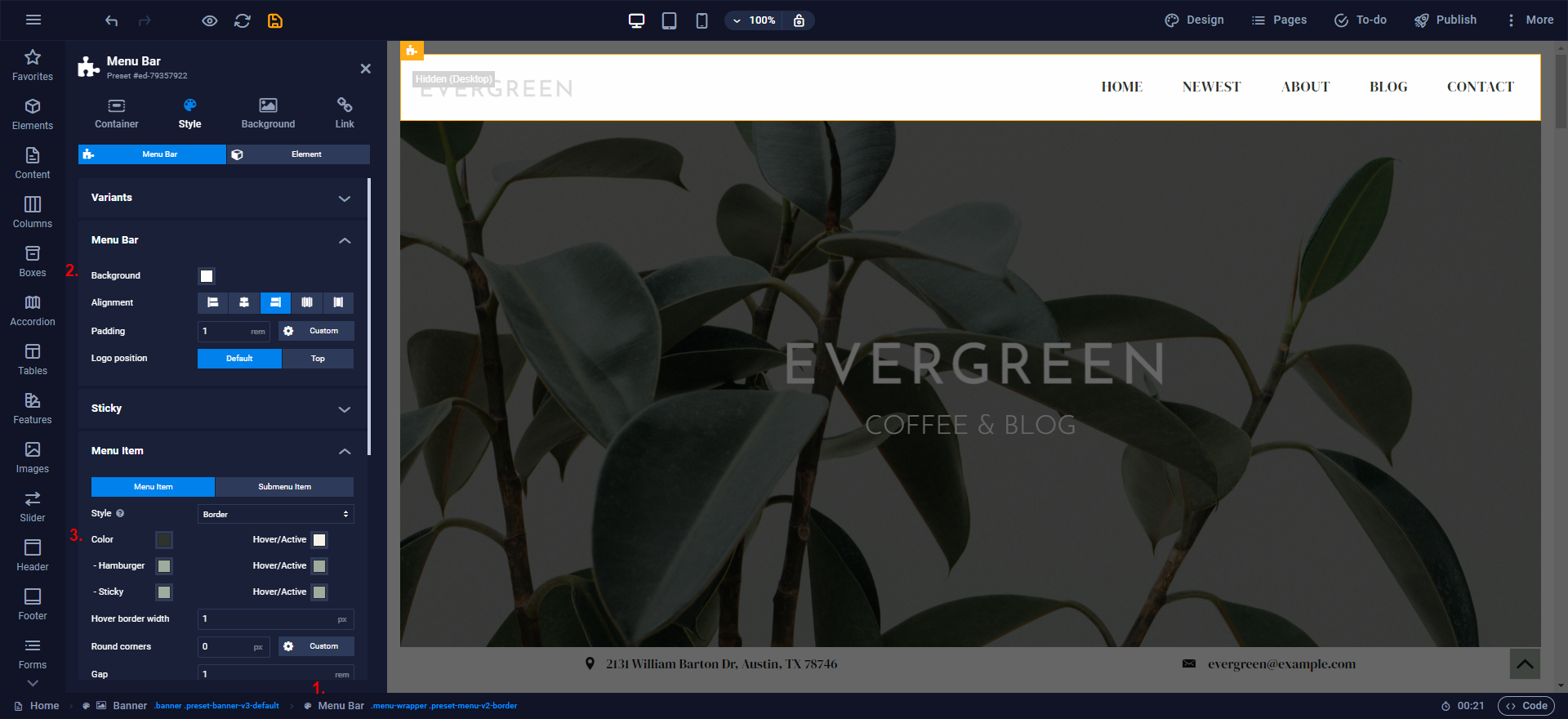 Since now the menu bar doesn't match with the new background, we will also adjust it to our needs. Double-click on the menu bar or use the breadcrumbs (1.). Now we change the background color (2.) of the menu bar to match the white border and then we adjust the menu item color (3.) so that we can read the different menu items again.