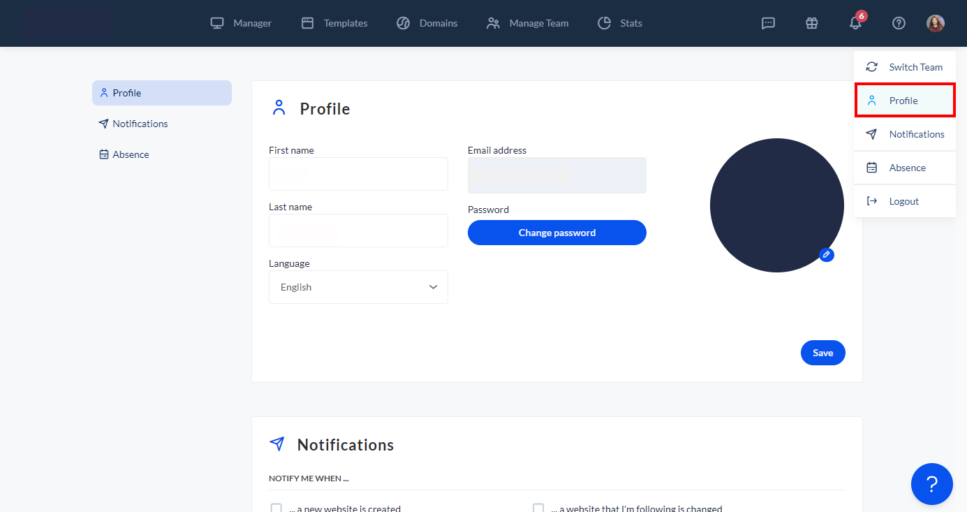 Notifications keep you informed about the current status of your projects. This is especially important if you are working in a team on several projects. For example, you can stay informed when a team member changes the status of a website or publishes it. Under "Notifications", set when Sitejet will send you automatic notifications by email. Simply tick the boxes for the situations when you'd like to receive notifications and then click "Save".