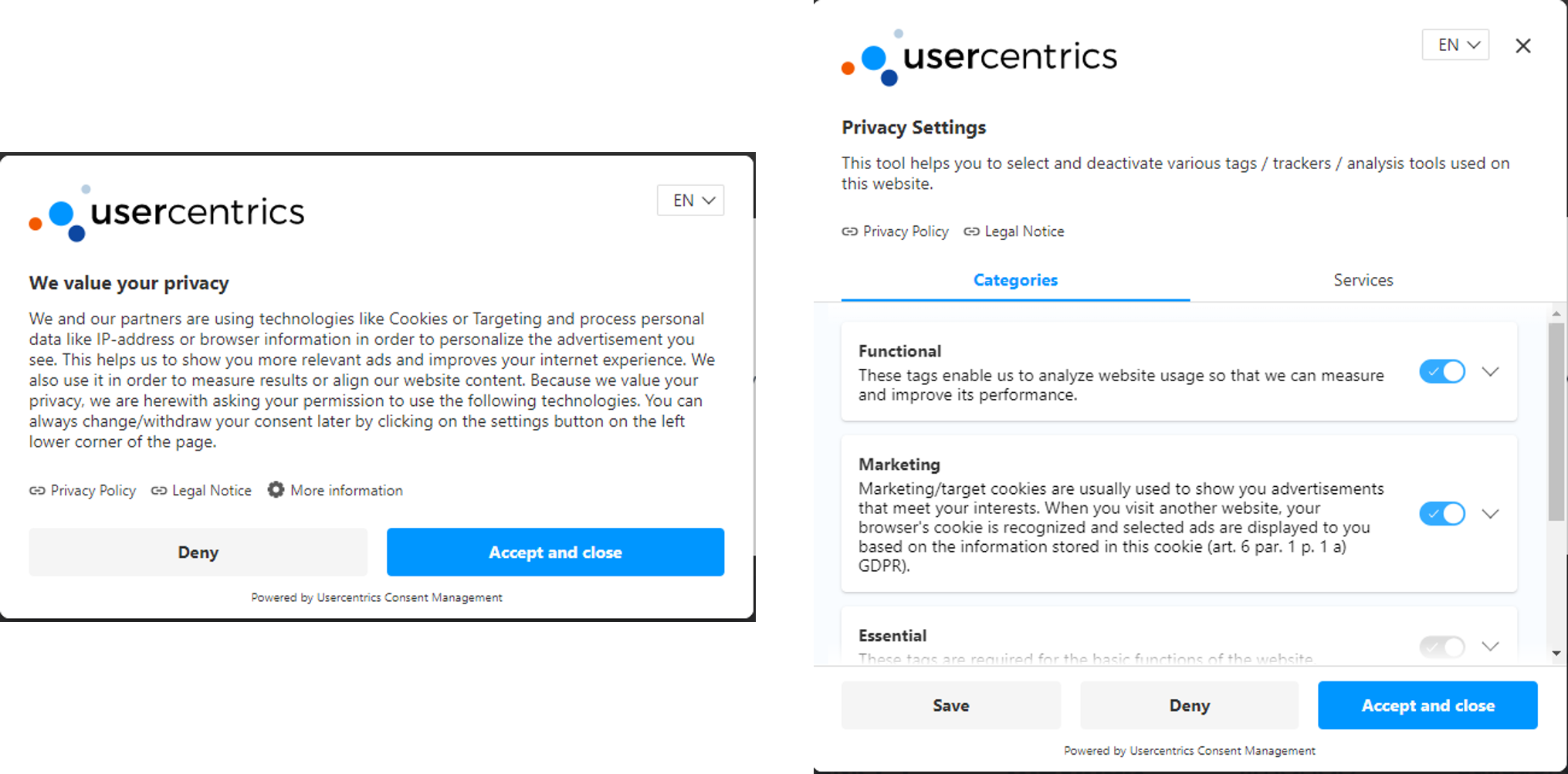 Usercentrics is CMP (Consent Management Provider) that offers a consent banner (also known as Cookie bar). According to established law, technically unnecessary cookies, as well as tracking and analytics services, may only be set and used on websites if the website visitor has given his or her explicit consent. For a GDPR-compliant solution the following requirements must be met: