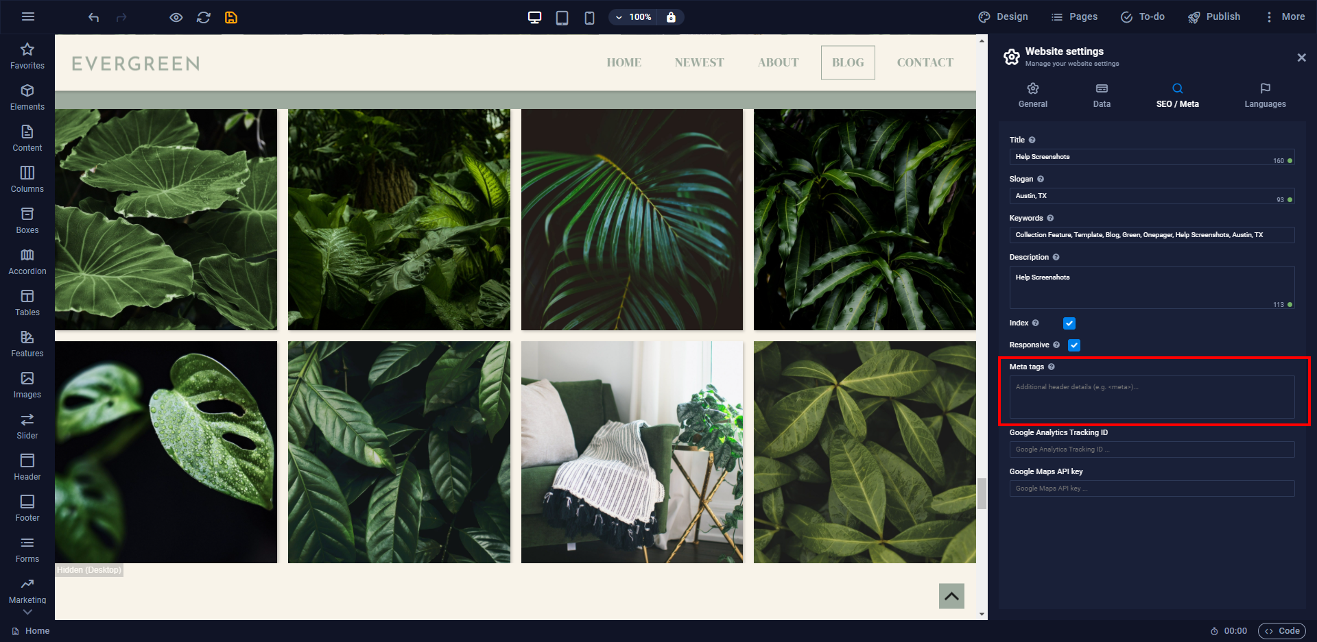 Once you copied the script you can head over to Sitejet and open the CMS for the respective website. Go to More > SEO and paste the code into the meta tags section: