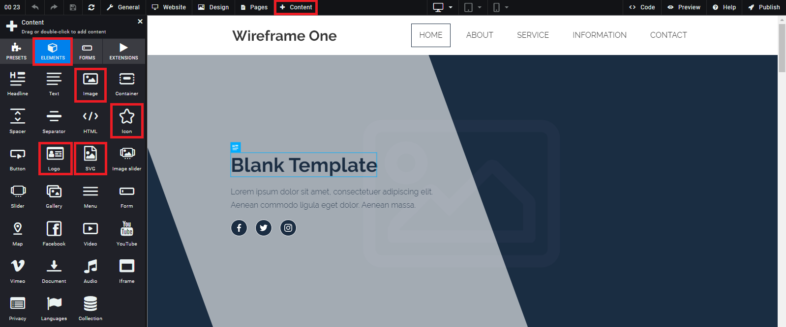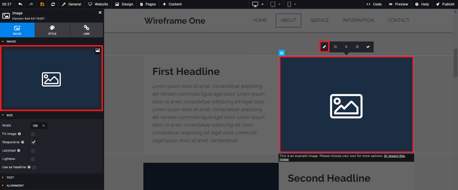- Look for "Image" and while pressing the left mouse key drag the image element to your preferred location on the website