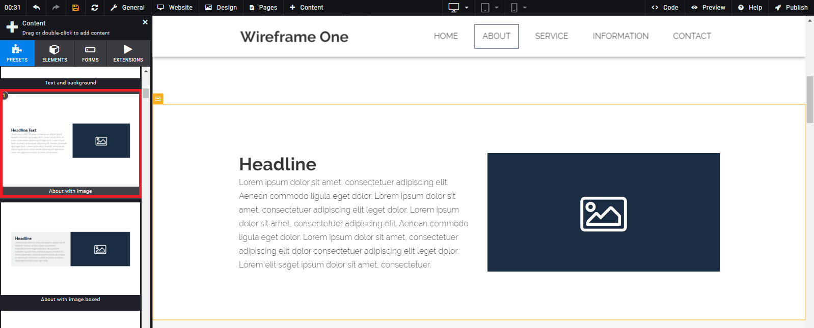 The "Image with text box" preset is available in the "Content" category in the left sidebar. As with an element, you can simply drag and drop the preset to the preferred position on the website.