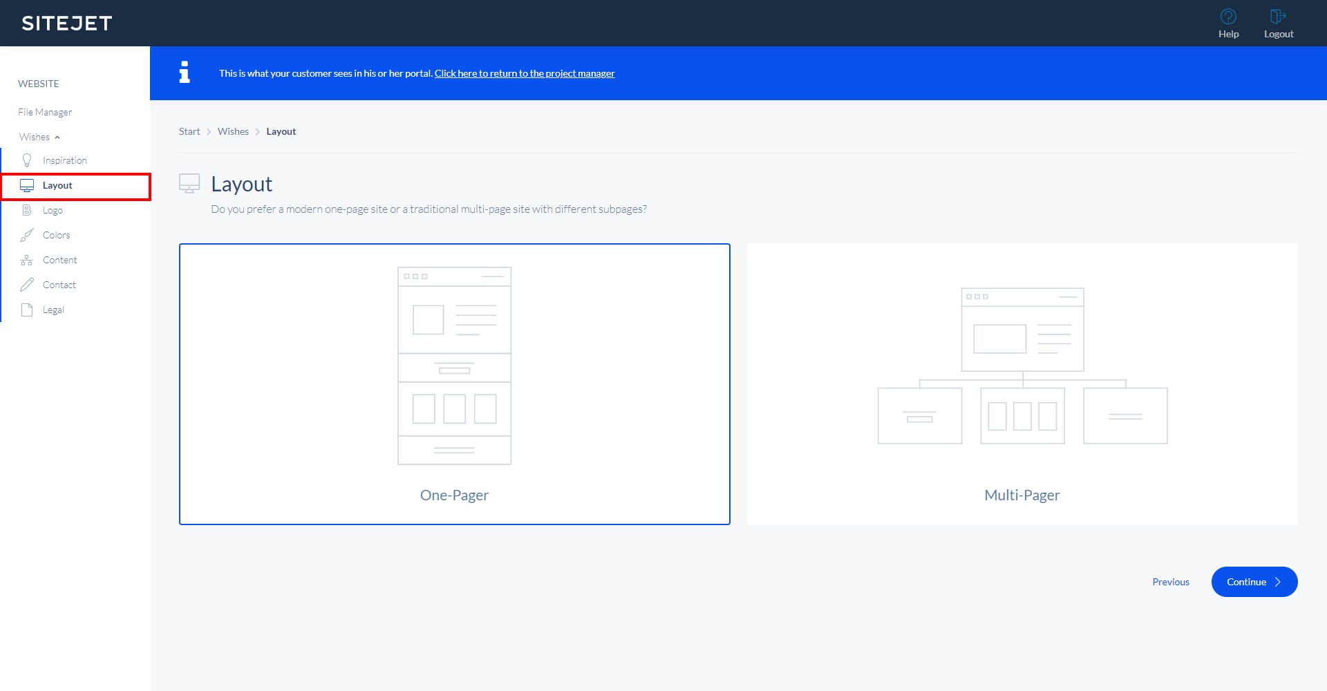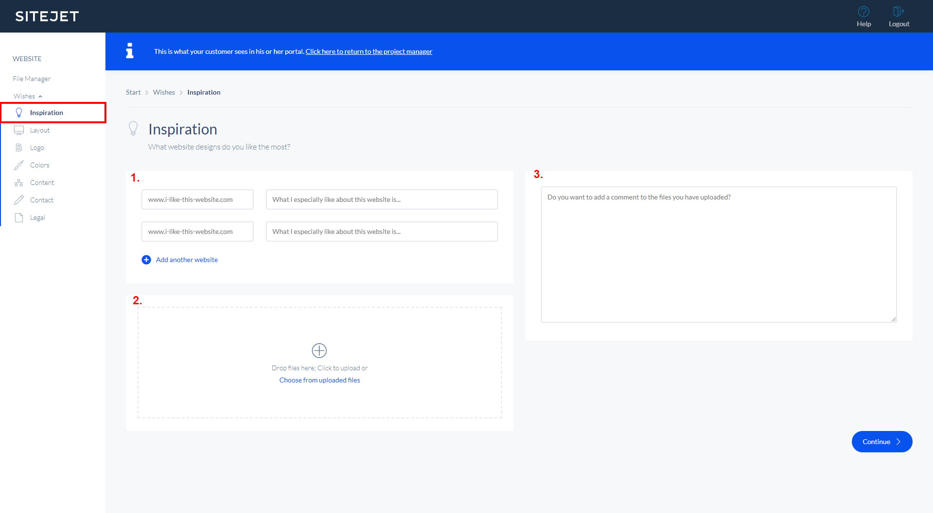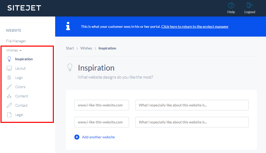 The Wishes section in the Customer Portal is an easy-to-use and fun way to gather all the necessary information like content, files, and requirements of your customers to create their dream website. This "pre-design survey" or "Briefing" covers all topics that are important for the website creation, e.g. does your customer already have a specific design in mind? Should you use logo colors for the website's color scheme? What kind of content should be displayed on the website? Does your customer have social media accounts that you should display on the website?