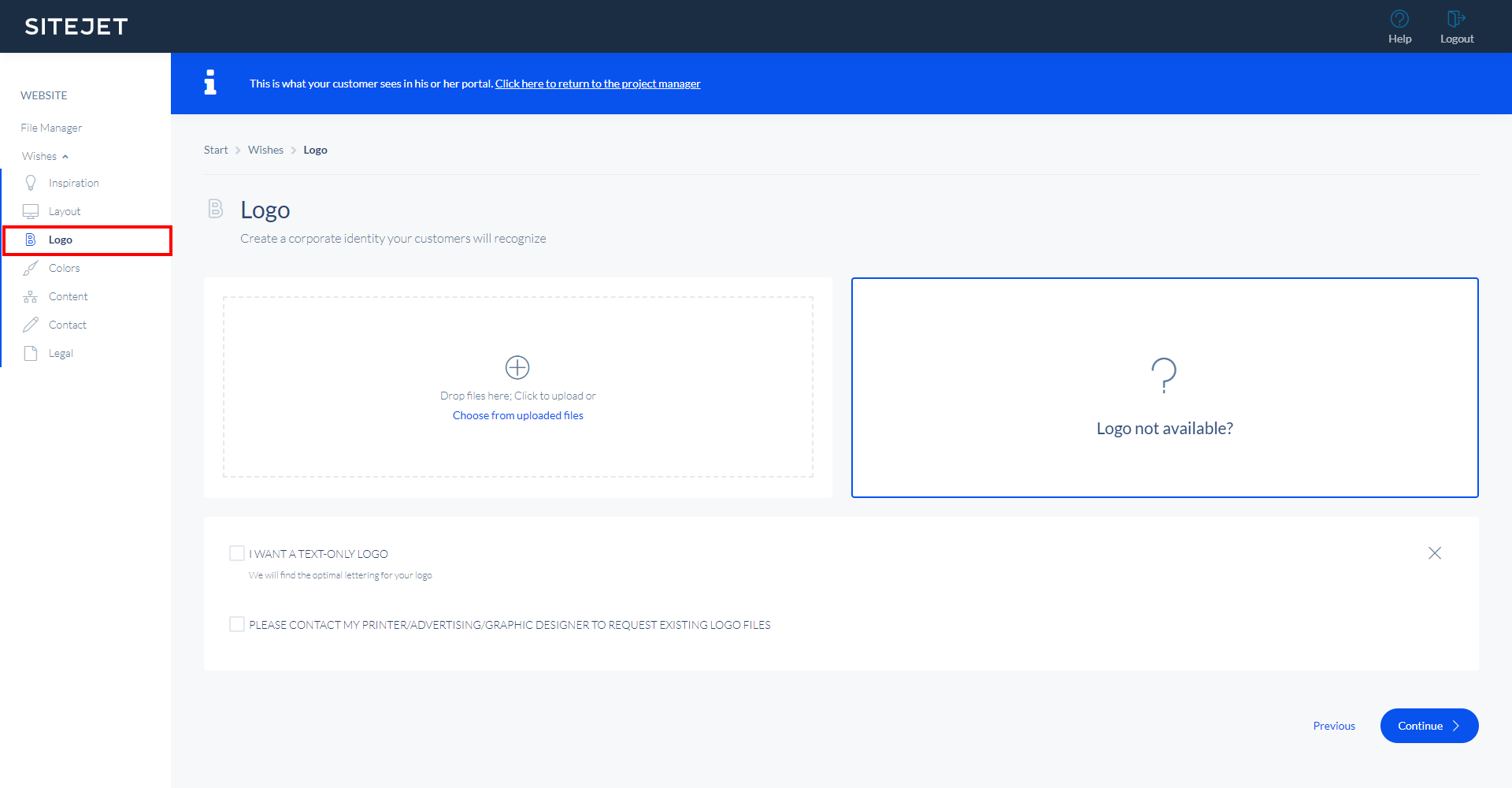 In this section, your customers can upload their logo. If they don't have a logo they can either select to use optimal lettering of their name as logo or they can ask you to contact their graphic designer etc. to get all necessary files and formats directly from the source.