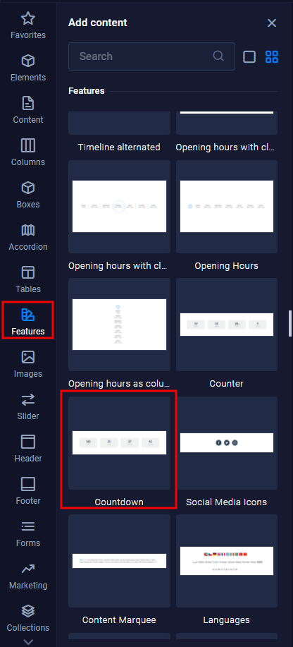 Go to the sidebar click on the category "Features" and scroll until you see "Countdown". You can also use the search bar at the top. Once you found the preset you can simply drag and drop it to your preferred position on the website.