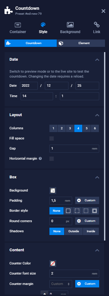 Once you have added the countdown a panel on the left will open. Here you can add the time and date (format YYYY/MM/DD) and adjust other settings like the number of columns, the gap between the boxes, background color of the boxes, or color of the counter. With those settings, you can easily customize the countdown to fit the design of your website.