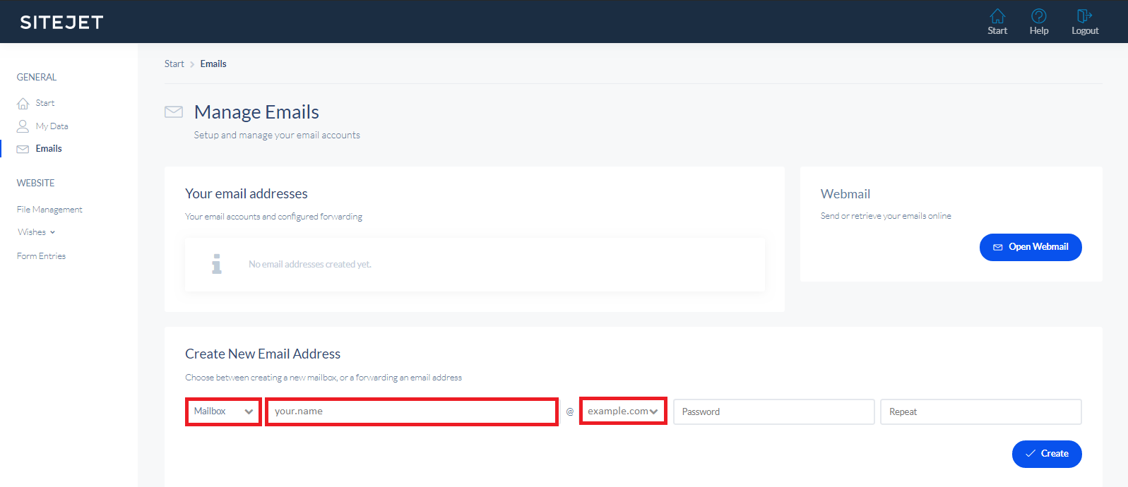 Tip: Use email addresses that belong to your domain. For example, if you have registered "www.your-domain.com", you can create email addresses such as "service@your-domain.com", "info@your-domain.com" or "your-name@your-domain.com".