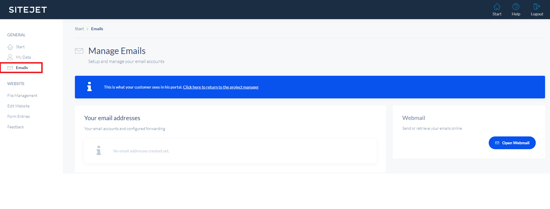 From the customer portal, you or your customers can simply click on "Emails" in the menu on the left to open the email manager.