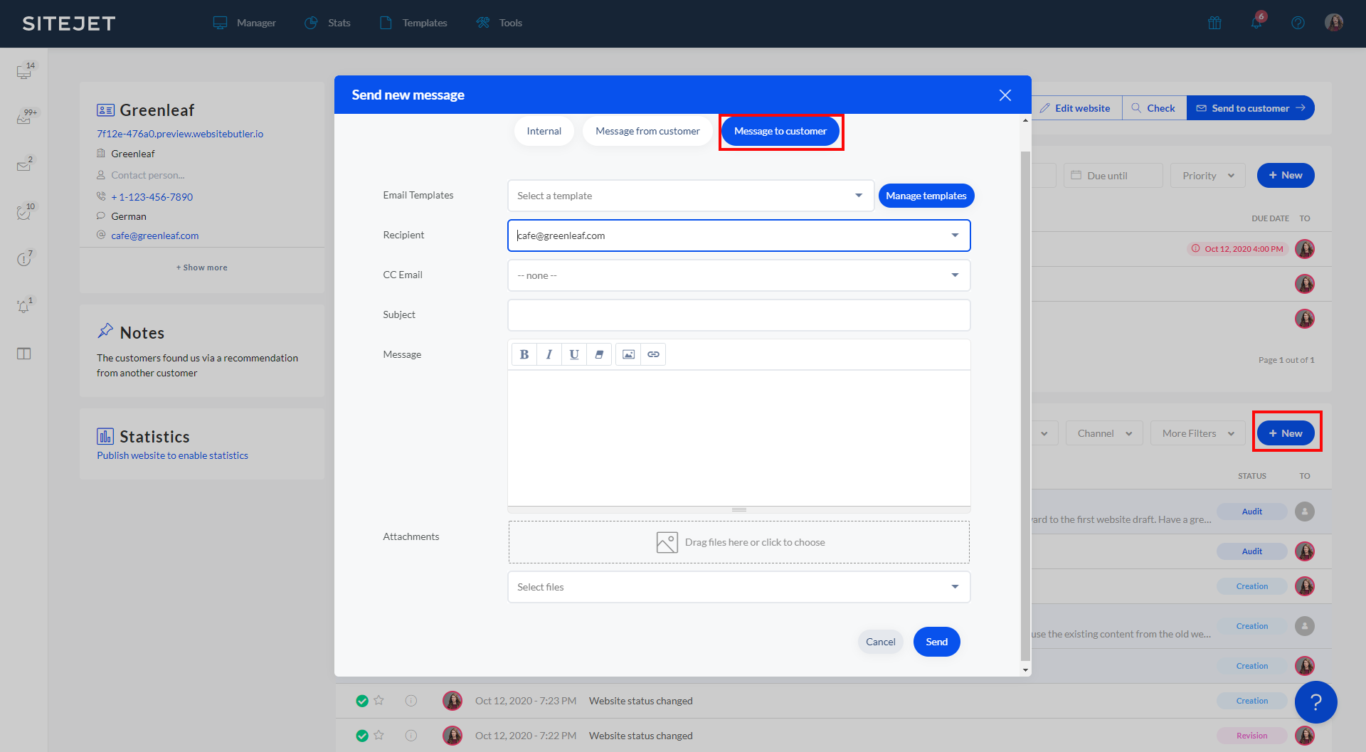 Click on "Message to customer" to send an email to your customer via Sitejet. The Recipient is automatically added, but you can also choose another email address or add a CC address. As with every email provider, you can add a subject line, your message with basic formatting, and attach files to the email.