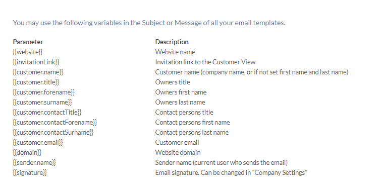 If you have certain emails that you will use frequently across all your customers, you can set up templates to save valuable time. Click on "Manage templates" when the "Message to customer" tab is opened and add as many templates as you like. You can choose an existing template to edit or use as a base for a new template. Give your new template a name, precompose a subject (e.g. Requesting further information for your website) and the message. Make use of variables to automatically generate helpful information like the customer's name, the website domain, or the invitation to the customer portal into the mail.