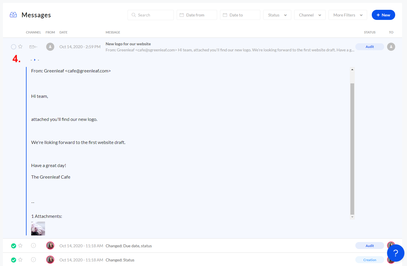 - You can also filter the messages by Categories (like Message from/to Customer, Internal, Partner, etc.) or its Status or More Filters (whether it has been marked as done or not)